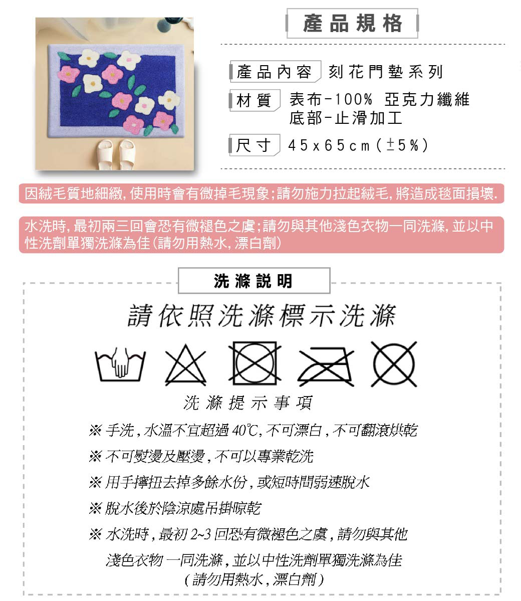 材質─100%亞克力纖維/底部止滑加工(採用黃膠加工止滑,局部顏色較深,不影響止滑效果,請安心使用)