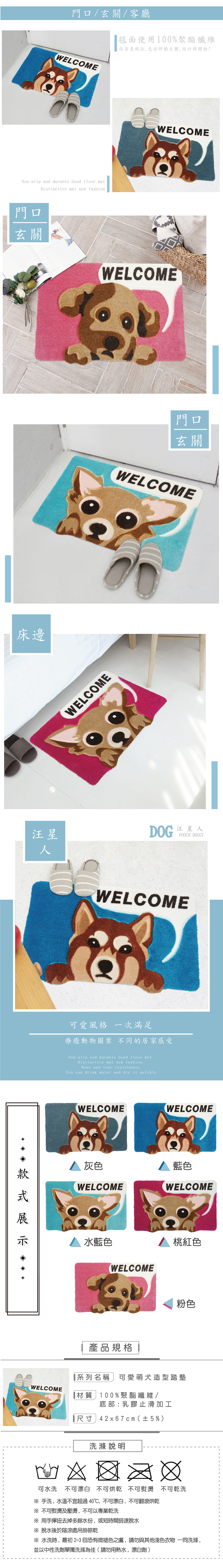 汪星人立體刻花玄關地墊,使用高密度織法,色彩鮮豔立體,圖案栩栩如生,觸感舒適柔軟且不易掉毛,底部使用乳膠止滑加工,讓你踩踏更安心,安全性更高!玄關、門口、各種出入口都適合放一塊,讓進出更乾淨整潔,5種顏色,不同的可愛狗狗任你挑選!