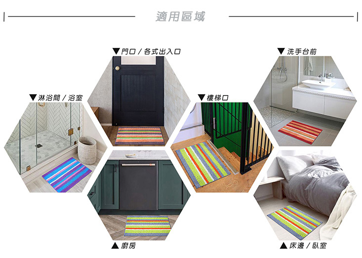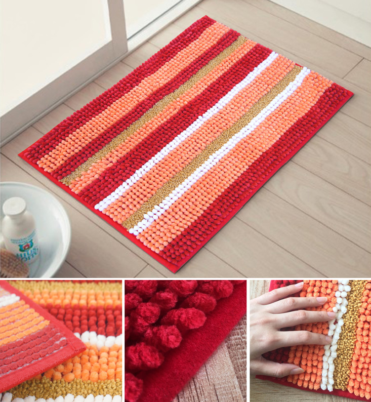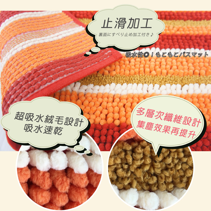 此款地墊改良舊版倒毛易發霉的缺點,採用立體超高密度絨毛設計,使用100%超細纖維,觸感柔和不易掉毛,底部超止滑加工,為您的使用安全加分。隔離室內灰塵與吸水速乾,超實用的功能才是讓人豎起大拇指說讚的地方!當您出入浴室或盥洗空間,雙腳踩踏於舒適柔軟的浴墊,一來可迅速吸去腳底的水份,避免滑倒;二來又可避免水珠滴在地板上造成污漬。清洗方式超便利,洗衣機、手洗皆可,輕鬆又省事。時尚繽紛的跳色設計,幫您增添空間氣氛,適合搭配多種室內裝潢,亦可放置在玄關前或和室走道,避免刮傷磁磚或木質地板,是您居家不可或缺的佈置良品!