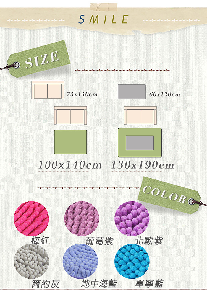 SMILE 簡約柔纖地毯(100x140cm)(共六色)