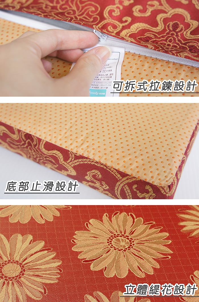 記憶型坐墊,採高品質惰性聚合記憶泡棉,耐久不易變形。厚度能有效分散身體的重量,久坐依然舒適。布套質地細緻透氣,布套樣式採喜氣的紅色系搭配太陽花紋,溫馨感十足;布套可拆洗,清潔方便不費力。全程台灣精製,除了適用於實木座椅、藤椅外,亦可用於和室、辦公室座椅或電腦椅等,質感、舒適多重優點兼具!